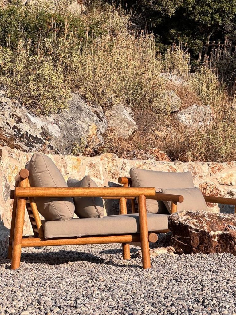 The dining area gives way to an expanse of decking, sun loungers and umbrellas next to the main body of the pool. Just below this is a sitting area with a collection of well-cushioned armchairs looking out at the views.