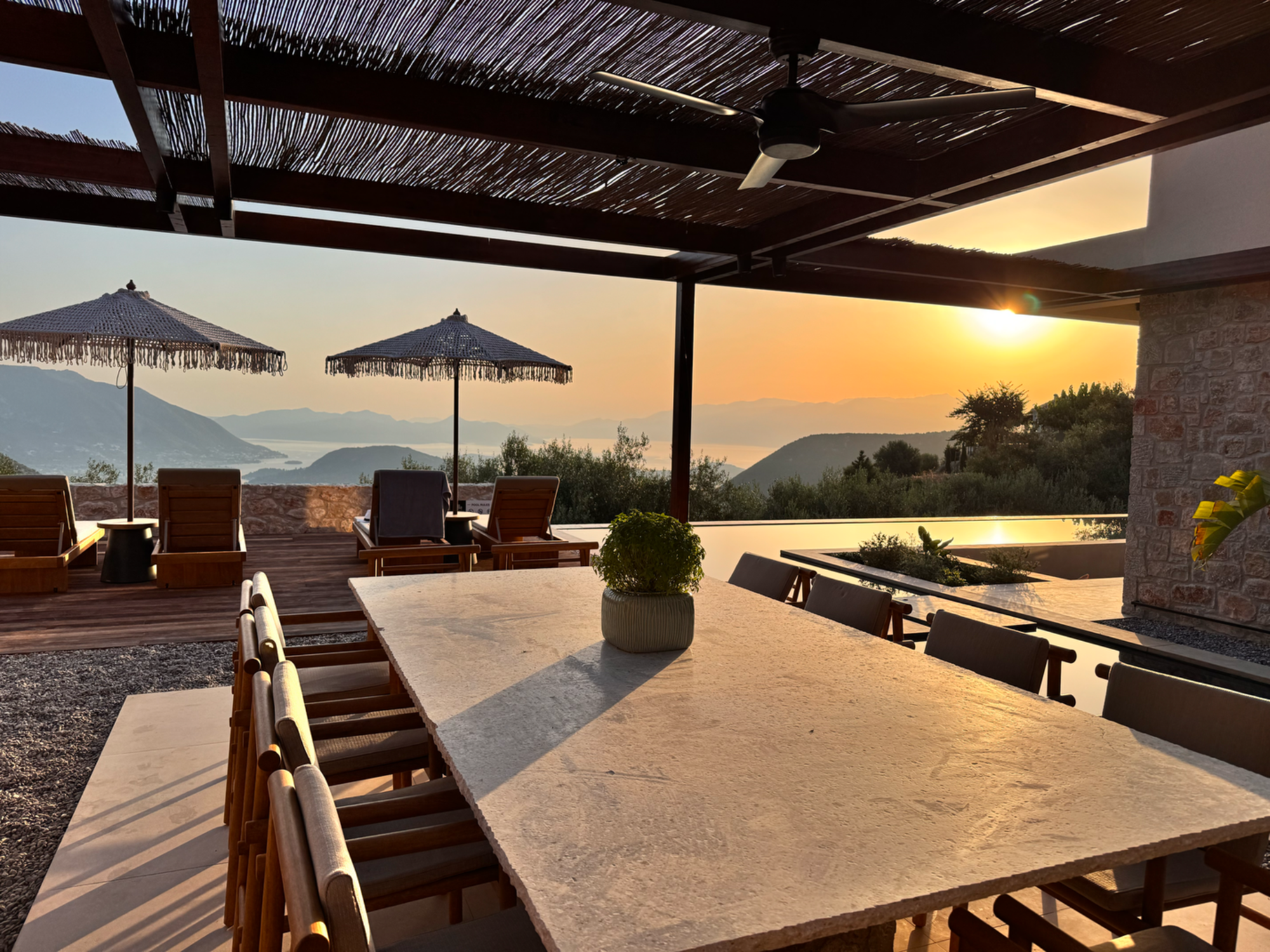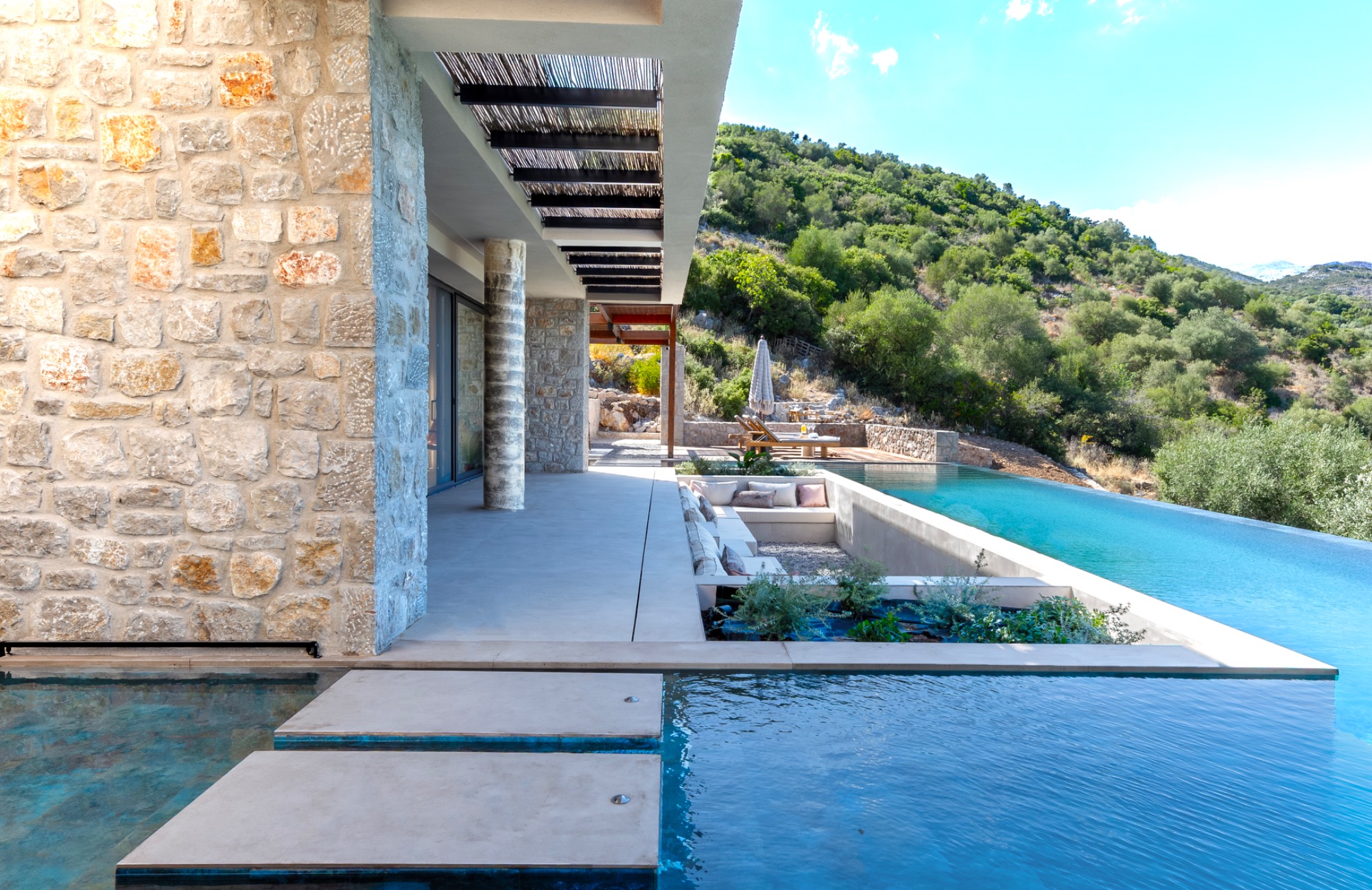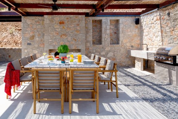 Al fresco life at Villa Galinia revolves around the fabulously panoramic and wondertully spacious pool terrace. Outside, the expansive terrace invites you to soak up the Mediterranean sun, with the long stretch of private pool featuring a striking sunken lounge as its centrepiece.