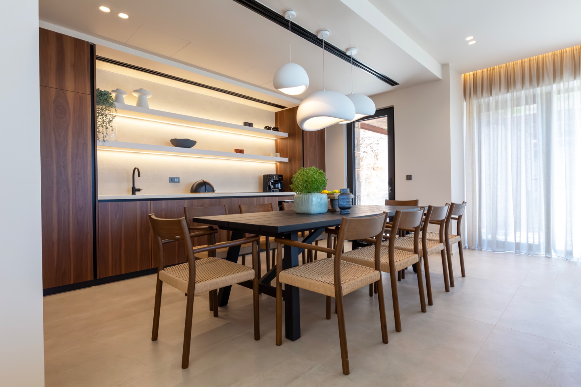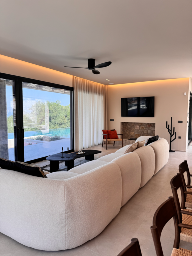 At the heart of the ground floor space, is an elegant open-plan living area with fireplace, flooded with natural light from floor-to-ceiling windows that showcase the stunning surroundings. This welcoming space flows effortlessly into a fully equipped kitchen and dining setting, offering an ideal for both relaxation and socializing. Here, natural light floods the space, drawing the eye toward the villa's outdoor expanse-where the end-to-end private pool and a sun-dappled terrace await.