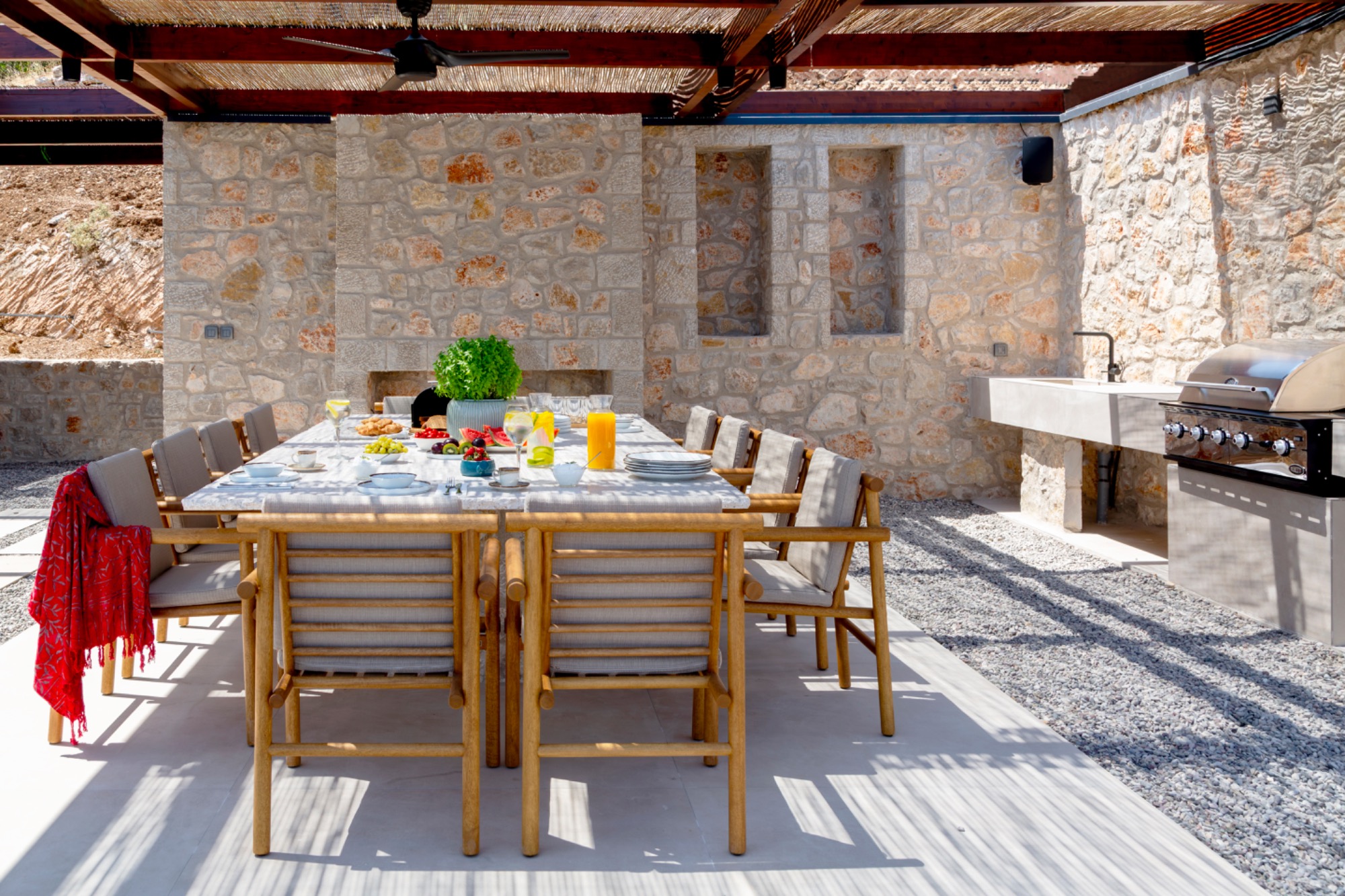 The sea-view terrace that hosts the pool runs along the entire villa. A wooden flooring with cushions and sunloungers is conveniently placed for the three ground floor bedrooms. To the other is another space with wooden flooring and equipped with sun loungers. The place for gatherings is the well shaded outdoor dining setting with outdoor kitchen equipped with the highest of quality gas BBQ.